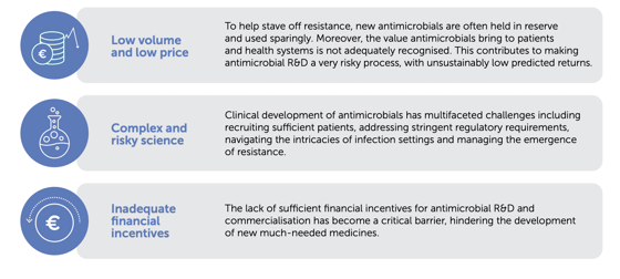 Despite the huge societal costs of AMR and the urgent need for antimicrobials, currently there is no viable market for new antimicrobials and pipelines are sparse.