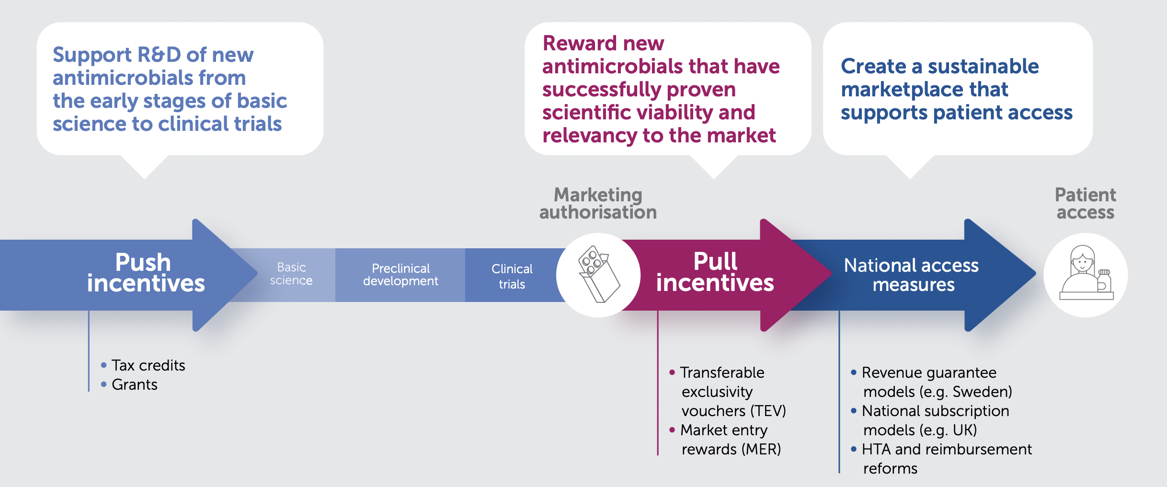 There is widespread agreement on the need for both push and pull incentives to address the lack of R&D of new antimicrobials. Push and pull incentives are complementary, as they seek to address different barriers to the development of new antimicrobials, but ultimately need to work together. Significant progress has been made in the implementation of push incentives. Nonetheless, a deficit in pull incentives persists.
