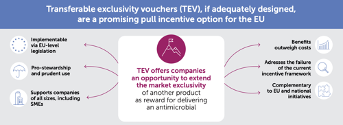 Well-crafted Transferable Exclusivity Vouchers (TEV) have emerged as a promising choice for pull incentives within the EU. TEV can effectively complement other policy-based incentives, such as strengthened value assessment and reimbursement reforms at the national level. Together, these measures synergise to ensure enduring access to vital treatments post-launch, while promoting the sustainability of antimicrobial innovation.
