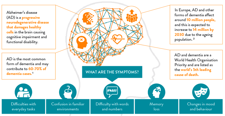 AD progresses in stages, with a long silent phase starting before its symptoms appear. Currently approved treatments help to alleviate some of the symptoms but there are no disease-modifying therapies (DMTs) that modify the disease, reverse or slow down its effects. Disease-modifying therapies would allow patients to live an independent life for longer, and maintain their cognitive capabilities and personality, leaving them more time with their friends and family.
