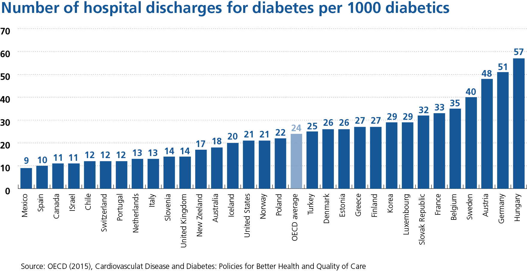 On average, 30% of health systems expenditure is spent on inpatient care. However, hospital admissions for chronic conditions are often avoidable, as illustrated by the wide variation between countries in the frequency of hospital discharges among patients with diabetes.