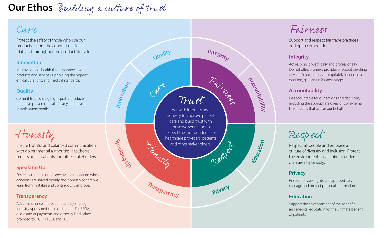 Industry understands the importance of working in an open and transparent way with health professionals, healthcare organisations, patients and the public in accordance with legislation and in an ethical framework. EFPIA Ethical Principles are included in the EFPIA Code of Practice, which is continually reviewed and adapted over time to reflect societal expectations for ethical business.