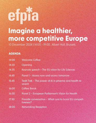 Save the date for the EFPIA Conference “IMAGINE a healthier, more competitive Europe” on the afternoon of 10 December 2024 at the Albert Hall in Brussels.