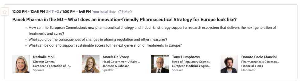 Nathalie Moll, EFPIA Director General, will join the virtual panel discussion entitled "Pharma in the EU – What does an innovation-friendly Pharmaceutical Strategy for Europe look like?" at 12:00pm-12:45pm GMT / 1:00pm-1:45pm CET on 9th November.