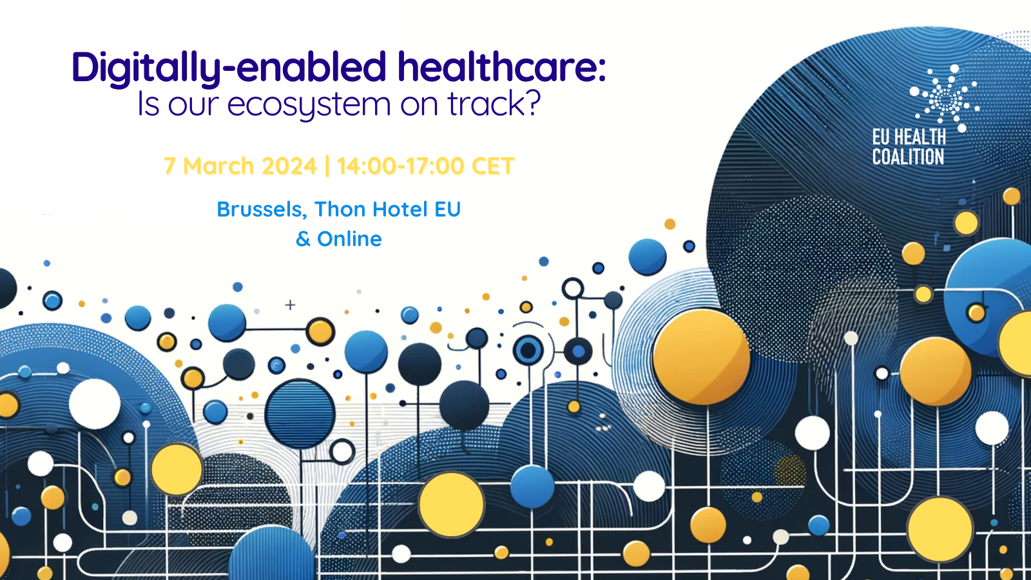 The EU Health Coalition is delighted to invite you to the hybrid event "Digitally-enabled healthcare: Is our ecosystem on track?", taking place on 7 March 2024 at the Thon Hotel EU, at Rue de la Loi 75, and online.