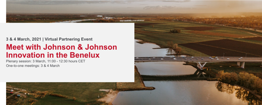 Meet the Johnson & Johnson Innovation team, 3 & 4 MarchCompanies/researchers/organisations that are based in the Benelux and interested in talking to the team and would like to be considered for an opportunity for a one-to-one virtual meeting need to apply by 12 February end-of-day CET by submitting their non-confidential information. Selected applicants will be invited for a virtual one-to-one meeting with one or more Johnson & Johnson Innovation team members on 3 or 4 March. Application details here.