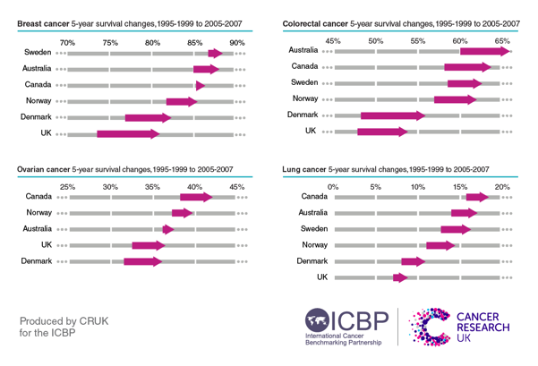 Analysis of 2.4 million cancer patient records showed that relative survival improved in all jurisdictions over this period. Survival is higher in Australia, Canada, and Sweden, intermediate in Norway and lower in Denmark and the UK (England, Northern Ireland and Wales).