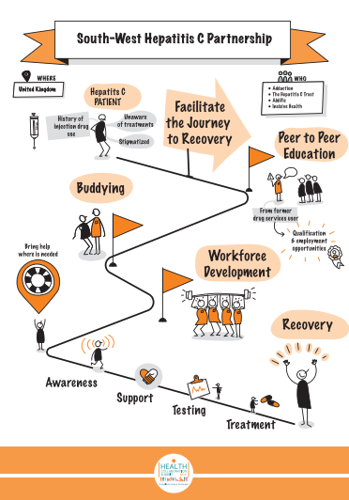 People who inject drugs are at high risk of contracting HCVThe Hepatitis C Trust, Addaction and AbbVie have pooled their skills to pilot a unique approach to supporting people with a history of injecting drugs, into HCV testing and treatment. A three-year pilot was rolled out across South West England, aiming to: identify what works best in empowering people to address HCV as part of their recovery journey; involve service users in testing the impact of peer education and buddying approaches; and upskill the Addaction team to confidently raise HCV issues with service users