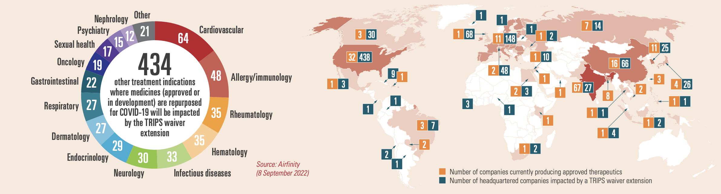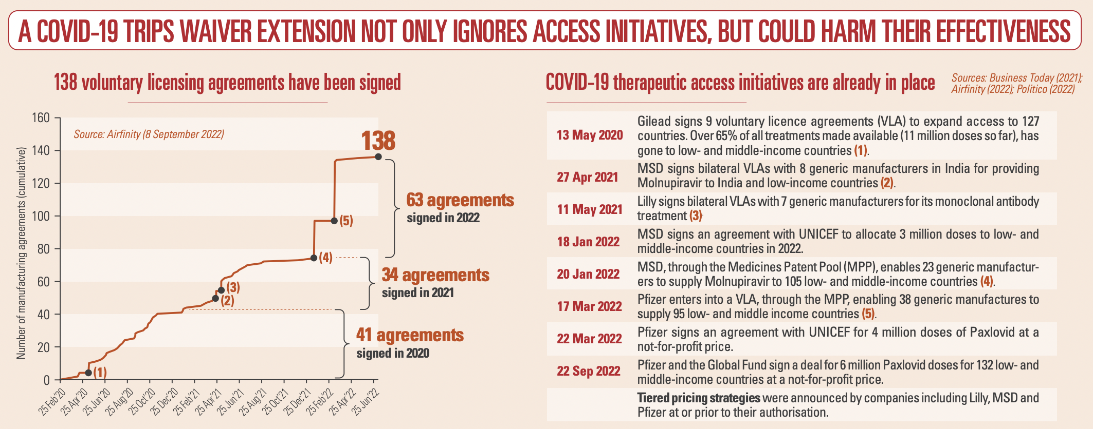 There is no shortage of COVID-19 therapeutics: production exceeds contracted demand for all variants, disease severity levels and in all patient settings. And with global testing declining rapidly, demand for treatments will decrease and become unpredictable. Partnerships with multilateral organisations and 138 voluntary licensing partnerships (Fig. 1) made it possible to ramp up production of therapeutics and, combined with tiered pricing and not-for-profit arrangements for low- and middle-income countries, mean that – for example – 99.9% of Africa and all of South Asia currently have access to the key therapeutics. A waiver would put the legal basis for these initiatives at risk including those under the Medicines Patent Pool (MPP).