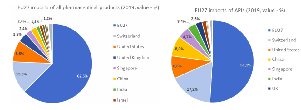 - Fact 3: An ECIPE (2020) data publication[5] shows that 77% of EU imports for all pharmaceutical products come from Europe itself (the EU, Switzerland and UK), followed by 8.8% of from the US. Only 2.4% and 1.3% of EU imports of pharmaceutical products come from China and India, respectively. Regarding active pharmaceutical ingredients (APIs), the roles for China and India are larger (8.0% of EU imports come from China and 3.4% from India) but still far behind the shares coming from the EU itself (51.1%), Switzerland (17.2%) and the US (8.8%).