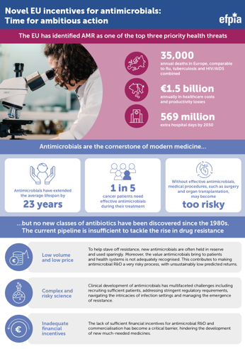 As discussions on the EU’s pharmaceutical legislation progress, policymakers have a unique opportunity to establish a predictable mechanism for urgent and much-needed sustainable antimicrobial R&D. By seizing this moment, Europe can play a leading role in the global response to AMR, delivering vital treatments for patients and securing substantial economic benefits. EFPIA is committed to working with stakeholders to help Europe strengthen its leadership in the fight against AMR.