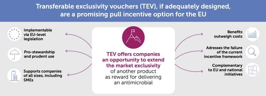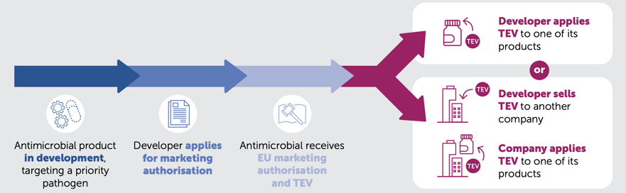 The European Commission estimates each TEV could be worth around €400 million, covering part of the EU's "fair share" of a global pull incentive, projected at approximately €1.4 billion, contributing to a worldwide effort to drive investment in new antimicrobials. Complementary access models under consideration by the Commission, along with initiatives in certain EU countries, could further support the EU in meeting its fair share.