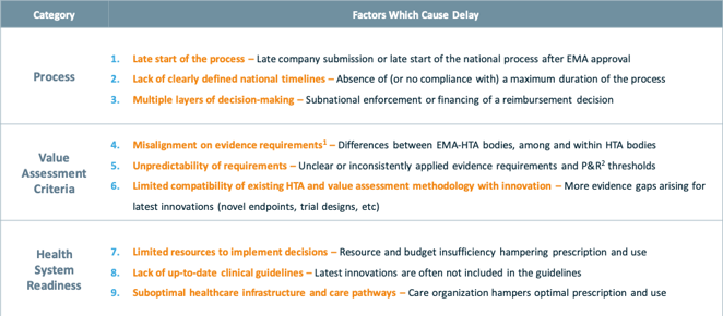 These nine factors carefully examine the existing healthcare operating system across Europe, as well as some of the existing rules and regulations which result in unintended consequences. As outlined in the table below, these nine factors focus on facts, systems and policies from the perspectives of Process, Value Assessment Criteria, and Health System Readiness, thus removing the traditional blaming and shaming, and enabling constructive assessment and problem-solving.