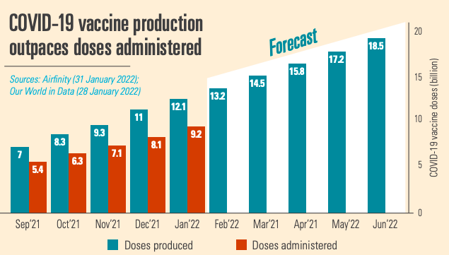 Starting from scratch in 2021, by January 2022 12.1 billion COVID-19 vaccine doses have been produced, 2.9 billion doses more than have been administered. So vaccine production is not the bottleneck. The manufacturing scale up would not have been possible without building new production lines able to produce millions of doses to the highest quality standards, managing global supply chains for hundreds of ingredients, and forging 357 voluntary licensing agreements around the world to increase manufacturing output. Further production expansions are planned, notably in Africa.
