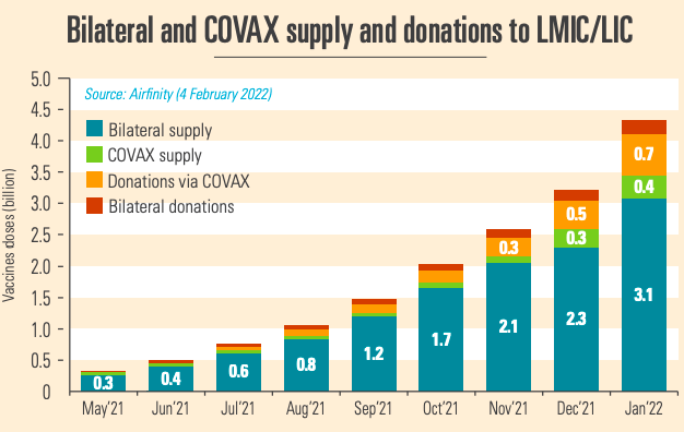 Produced vaccines need to be distributed globally. Trade restrictions have proved to be major bottlenecks to distribution. But in the second half of 2021 exports have increased rapidly, with major vaccine producing countries easing export restrictions on vaccines and supplies. This has led to 4.2 billion vaccines reaching lower middle income countries (LMICs) and low income countries (LICs), with COVAX shipments peaking in December 2021. With distribution no longer being a barrier to vaccine equity either, attention needs to focus on ensuring that distributed vaccines are swiftly deployed.
