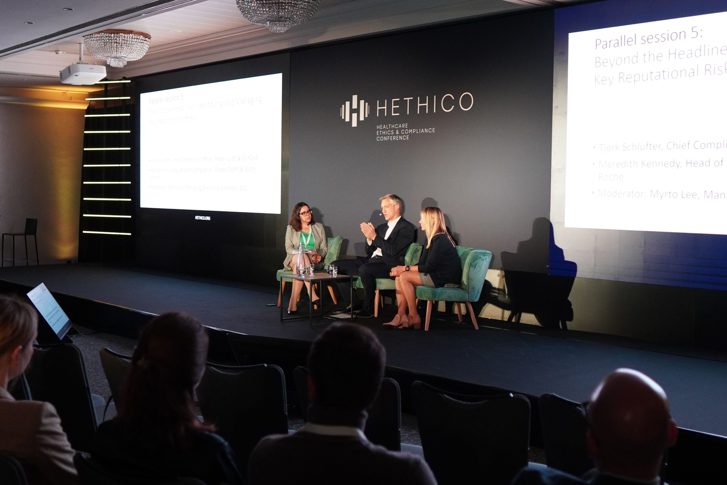 *The Beyond the Headlines panel at the HETHICO conference featured Myrto Lee, Managing Director & Partner at BCG; Tjerk Schlüfter (Chief Compliance Officer, Fresenius); and Meredith Kennedy (Head of Compliance – Europe North & South, Roche).