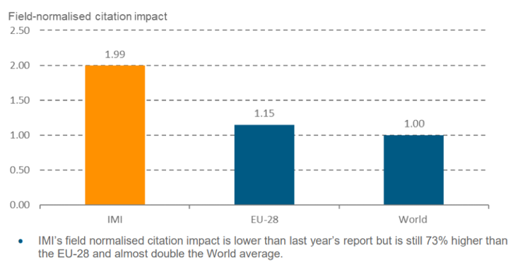 Not only is this research appearing in top journals, but many of the papers are also highly cited. In fact, around a quarter are in the top 10% of papers in their field. In addition, IMI papers had a considerably higher (73%) citation impact than the EU average citation impact in similar fields. This puts IMI in the top tier of science funding agencies globally.