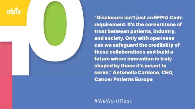 Since 2012, the EFPIA Code has required pharmaceutical companies to disclose all transfers of value—whether in the form of payments or in-kind support—to patient organisations. Many patient organisations also publish the funding they receive or provide such information on the produced materials. These disclosures reflect a shared commitment to integrity.