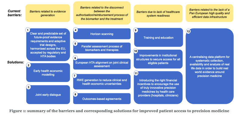 Precision medicine has been recognized for many years now as an approach to improve patient outcomes, and healthcare resilience. Yet, still today several barriers exist hampering the market and patient access to precision medicine. This paper summarized the key barriers and proposes concrete solutions for making progress with the ultimate goal to reach access to all eligible patients who can potentially benefit from it.