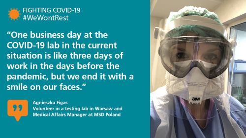 Agnieszka Figas is a Medical Affairs Manager at MSD Poland. Last month she decided to put her background in the fields of virology, biotechnology and laboratory diagnostics of viral infectious diseases at the disposal of the MSD volunteering programme fighting the pandemic by supporting a newly created laboratory in Warsaw performing tests on SARS-CoV-2.