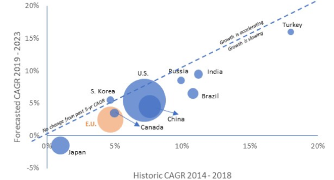 Europe’s relative share of the global market in terms of sales is also falling as shown in Figure 3 (the size of the bubble is the size of the market in 2018). From 2014-2018 the Indian, Brazilian and Chinese markets grew by 11.2%, 10.8%, and 7.6% respectively compared to an average market growth of 4.7% for the Top-5 EU markets and 7.2% for the US (IQVIA, 2019)[ix]. For the 2019-2023 forecasted period, except for Japan, all other geographical areas are expected to see higher spending growth than the EU, further reducing Europe’s attractiveness in the current European Commission term.