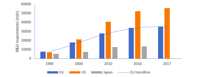 Despite these impressive figures, the relative position of Europe has eroded over the past 30 years. In 1990, R&D investments in the EU amounted to €7.8 billion, the highest R&D investments of any region in the world. In 2017, while R&D investments had risen to €35.3 billion, US R&D investment growth has way outpaced Europe (800% growth versus 450% for the EU) – as shown in Figure 2. Moreover, Figure 2 is incomplete in that it does not show the fast rise of China in terms of R&D investments since 2015 – which would reduce the relative performance of Europe further.