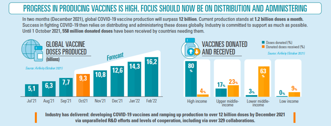 COVID-19 has shown the incredible complexity of the vaccine ecosystem, but the crisis has also driven a powerful response at all levels on R&D, production and vaccination. The vaccine industry has worked non-stop from day one of the pandemic to engage in R&D and then production to deliver safe and effective vaccines in record time around the world.Since the COVID-19 pandemic was declared, production has increased to 9.3 billion (October 2021), increasing by over 1.2 billion per month. At this rate, by December 2021 that figure will rise to over 12 billion doses. Exports are increasing rapidly, with EU-based producers having exported over 1 billion vaccines to date. Over 500 million doses have been donated to lower-middle and low-income countries so far and is rising rapidly.