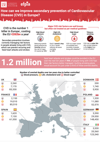 Commissioned and funded by EFPIA, this report was produced by LSE experts using data from seven European countries: Denmark, France, Germany, Italy, Poland, Spain and the United Kingdom. It found that enhancing secondary prevention in these countries could prevent 67,170 fatal cardiovascular (CV) events (heart attack and stroke) per year. This equates to 671,700 avoided fatal CV events over the next ten years via improved management of hypertension, hyperlipidaemia and diabetes.