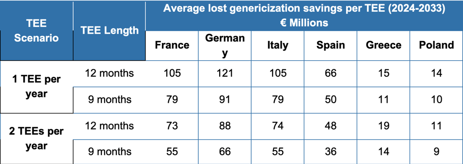 Concerns have been raised that TEE could lead to increased costs from lost genericization of other medicines. However, the report highlights the significant difference between the cost-savings delivered by TEE (above) and cost to healthcare systems of extending the exclusivity of another product using the voucher (below):